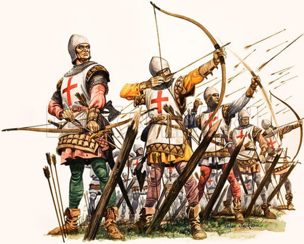 ინგლისელებმა მაღლობზე დაიკავეს პოზიციები. მათი ლაშქარი სამ ჯგუფად დანაწილდა: თითოეულის ცენტრში ქვეითი რაინდები იდგნენ, უკან – შუბოსნები, ხოლო ფლანგებზე მშვილდოსნები იდგნენ. წინ სარები ჰქონდათ ჩარჭობილი, რათა მტრის კავალერიის იერიშები შეეკავებინათ.